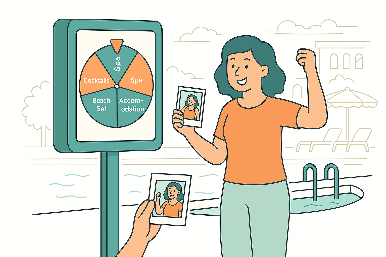 Fotoğraf çekiminden sonra kazı kazan veya çevir kazan gibi oyunlaştırılmış ekranlar sayesinde misafirlerinize eğlenceli ödüller sunabilirsiniz. Bu ödüller, spa indirimi ya da içecek ikramı gibi basit ama etkili teşvikler olabilir.